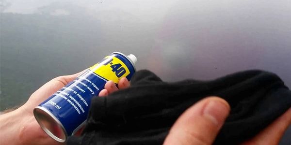 Нанесите WD-40 на загрязненный участок и оставьте на 10-15 минут. За это время смола начнет впитывать средство. Остатки следует удалить с помощью влажной тряпки.