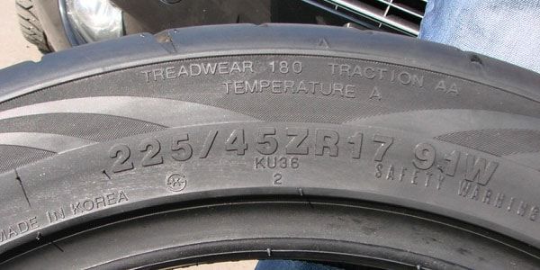 На всех шинах имеется маркировка. С ее помощью можно узнать размер, индекс скорости и нагрузки, а также информацию о производителе. Шина состоит из борта, каркаса, боковины, протектора и слоев брекера. Если вы повернете покрышку боковой частью к себе, то увидите обозначения в следующем порядке: ширина, профиль и диаметр. Например, шина с шириной 225, профилем 45Z и диаметром R17 представлена ниже:
