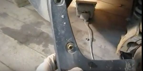 - Находясь под бампером, открутите болт, который соединяет нижнюю часть бампера с кузовом.